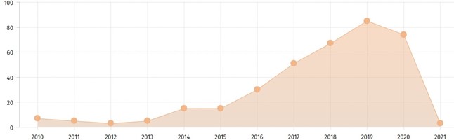 Resoluciones sobre responsabilidad penal de las personas jurídicas dictadas por los tribunales desde 2010 a 2021. Fuente: Jurimetría (https://jurimetria.wolterskluwer.es)